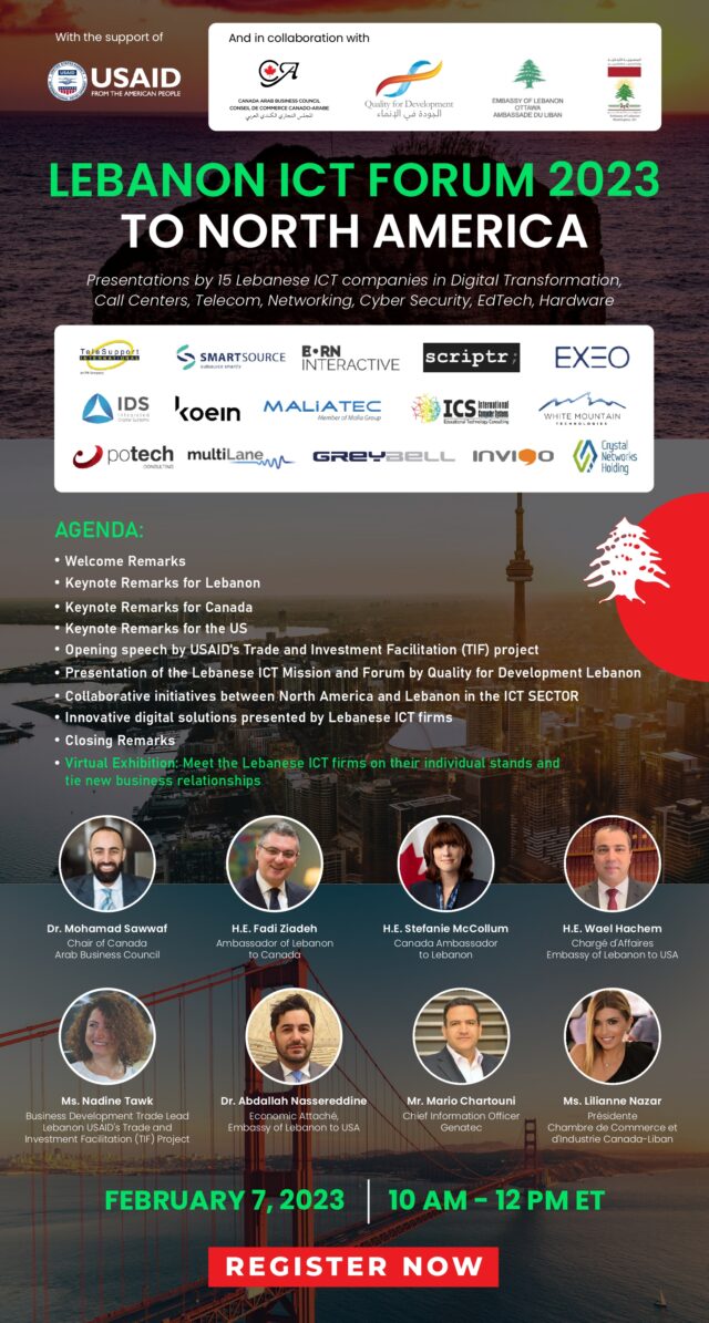 CABC hosted Lebanon in its first virtual event, Lebanon ICT Business Forum 2023 to North America which was held on the 7th February from 10 am – 12 pm ET. This event was supported by USAID’s Trade and Investment Facilitation (TIF) project, Quality For Development (QFD) and Daimlas.